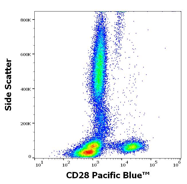 Flow cytometry surface staining pattern of human peripheral whole blood stained using anti-human CD28 (CD28.2) Pacific Blue™ antibody (4 μl reagent / 100 μl of peripheral whole blood).
