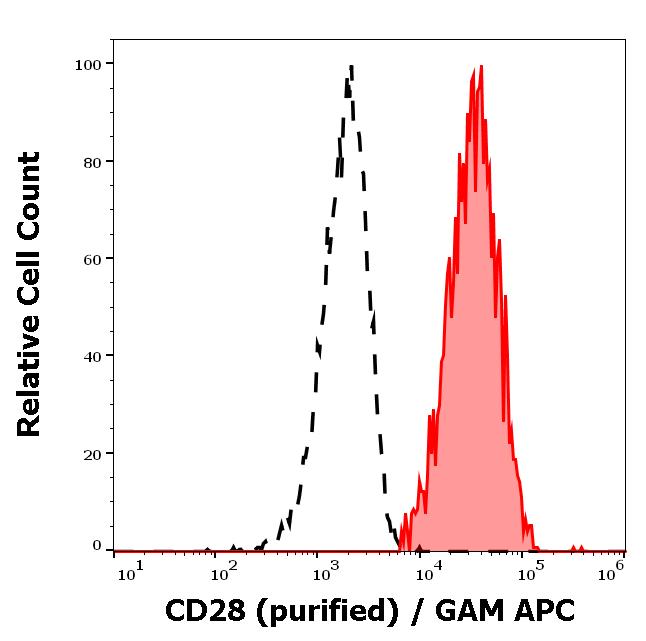 Separation of human CD28 positive lymphocytes (red-filled) from neutrophil granulocytes (black-dashed) in flow cytometry analysis (surface staining) of human peripheral whole blood stained using anti-human CD28 (CD28.2) purified antibody (concentration in sample 1,6 μg/ml) GAM APC.