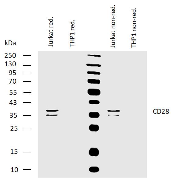 Western blotting analysis of human CD28 using mouse monoclonal antibody CD28.2 on lysates of Jurkat cells and THP1 cells (negative control) under reducing and non-reducing conditions. Nitrocellulose membrane was probed with 2 µg/ml of mouse monoclonal antibody followed by IRDye800-conjugated anti-mouse secondary antibody. CD28 was detected around 35-40 kDa.