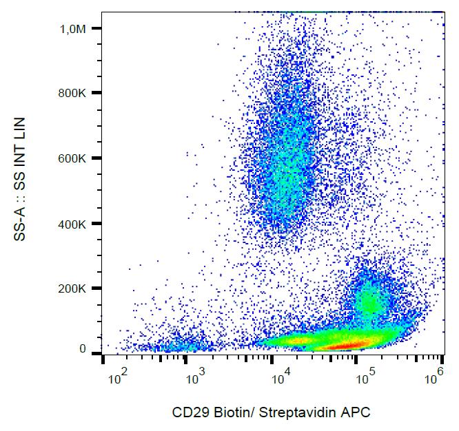Flow cytometry analysis (surface staining) of human peripheral blood with anti-human CD29 (MEM-101A) biotin, streptavidin-APC.