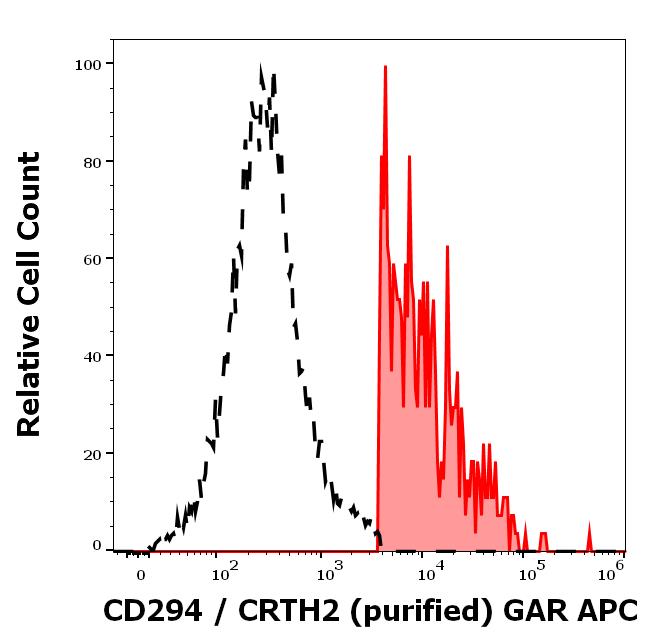Separation of human CD294 positive lymphocytes (red-filled) from CD294 negative lymphocytes in flow cytometry analysis (surface staining) of human peripheral whole blood stained using anti-human CD294/CRTH2 (BM16) purified antibody (concentration in sample 5,0 μg/ml, GAR APC).