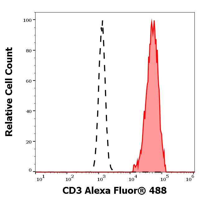 Separation of human CD3 positive lymphocytes (red-filled) from neutrophil granulocytes (black-dashed) in flow cytometry analysis (surface staining) of human peripheral whole blood stained using anti-human CD3 (OKT3) Alexa Fluor® 488 antibody (4 μl reagent / 100 μl of peripheral whole blood).
