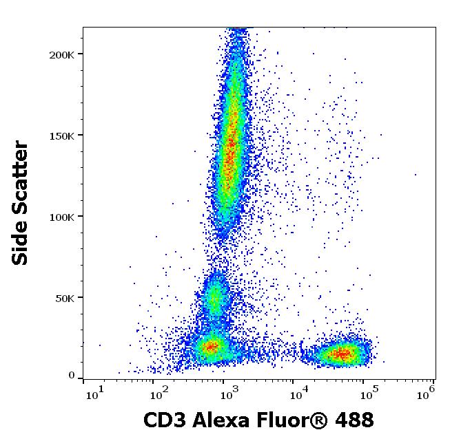 Flow cytometry surface staining pattern of human peripheral whole blood stained using anti-human CD3 (OKT3) Alexa Fluor® 488 antibody (4 μl reagent / 100 μl of peripheral whole blood).