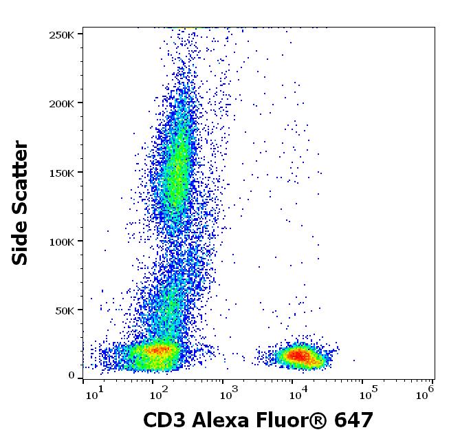 Flow cytometry surface staining pattern of human peripheral whole blood stained using anti-human CD3 (UCHT1) Alexa Fluor® 647 antibody (4 μl reagent / 100 μl of peripheral whole blood).