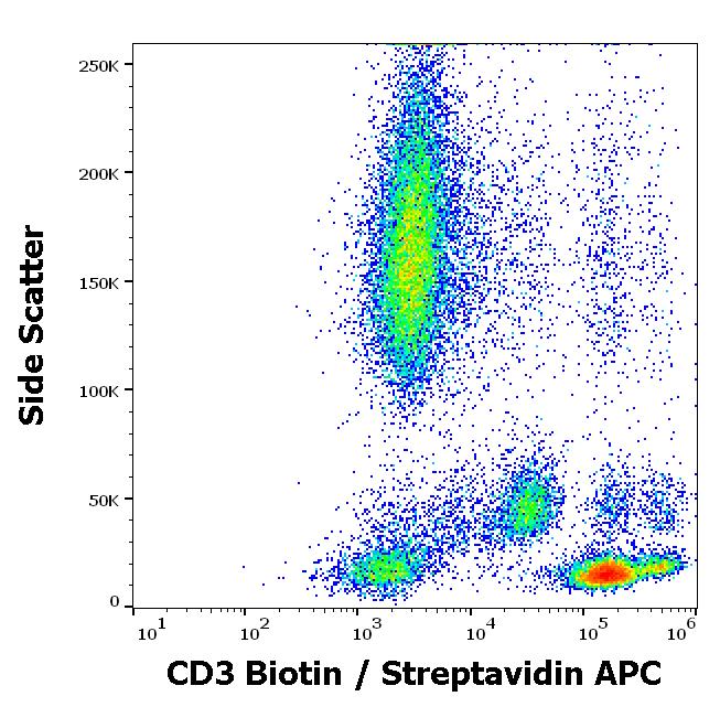 Flow cytometry surface staining pattern of human peripheral whole blood stained using anti-human CD3 (MEM-57) biotin antibody (concentration in sample 4 μg/ml) streptavidin APC.