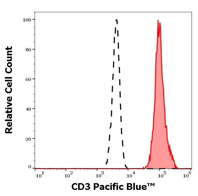 Separation of human CD3 positive lymphocytes (red-filled) from neutrophil granulocytes (black-dashed) in flow cytometry analysis (surface staining) of human peripheral whole blood stained using anti-human CD3 (UCHT1) Pacific Blue™ antibody (4 μl reagent / 100 μl of peripheral whole blood).