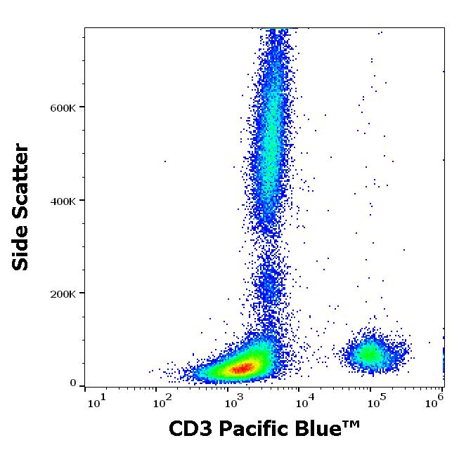 Flow cytometry surface staining pattern of human peripheral whole blood stained using anti-human CD3 (UCHT1) Pacific Blue™ antibody (4 μl reagent / 100 μl of peripheral whole blood).