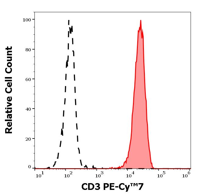 Separation of human CD3 positive lymphocytes (red-filled) from neutrophil granulocytes (black-dashed) in flow cytometry analysis (surface staining) of human peripheral whole blood stained using anti-human CD3 (UCHT1) PE-Cy™7 antibody (4 μl reagent / 100 μl of peripheral whole blood).