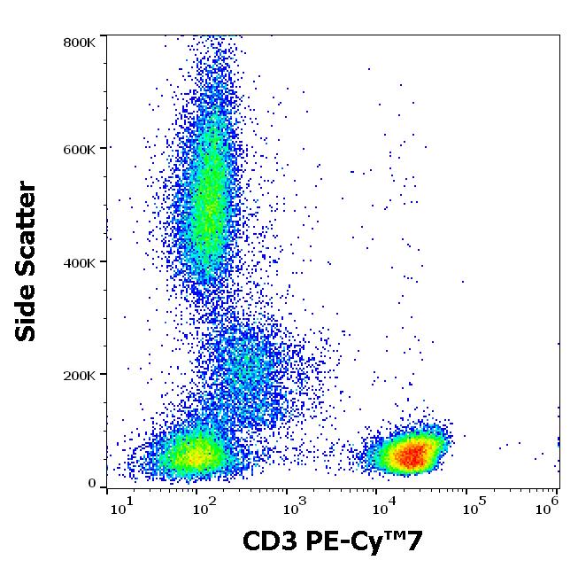 Flow cytometry surface staining pattern of human peripheral whole blood stained using anti-human CD3 (UCHT1) PE-Cy™7 antibody (4 μl reagent / 100 μl of peripheral whole blood).