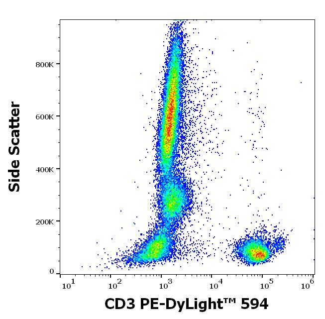 Flow cytometry surface staining pattern of human peripheral whole blood stained using anti-human CD3 (MEM-57) PE-DyLight™ 594 antibody (4 μl reagent / 100 μl of peripheral whole blood).