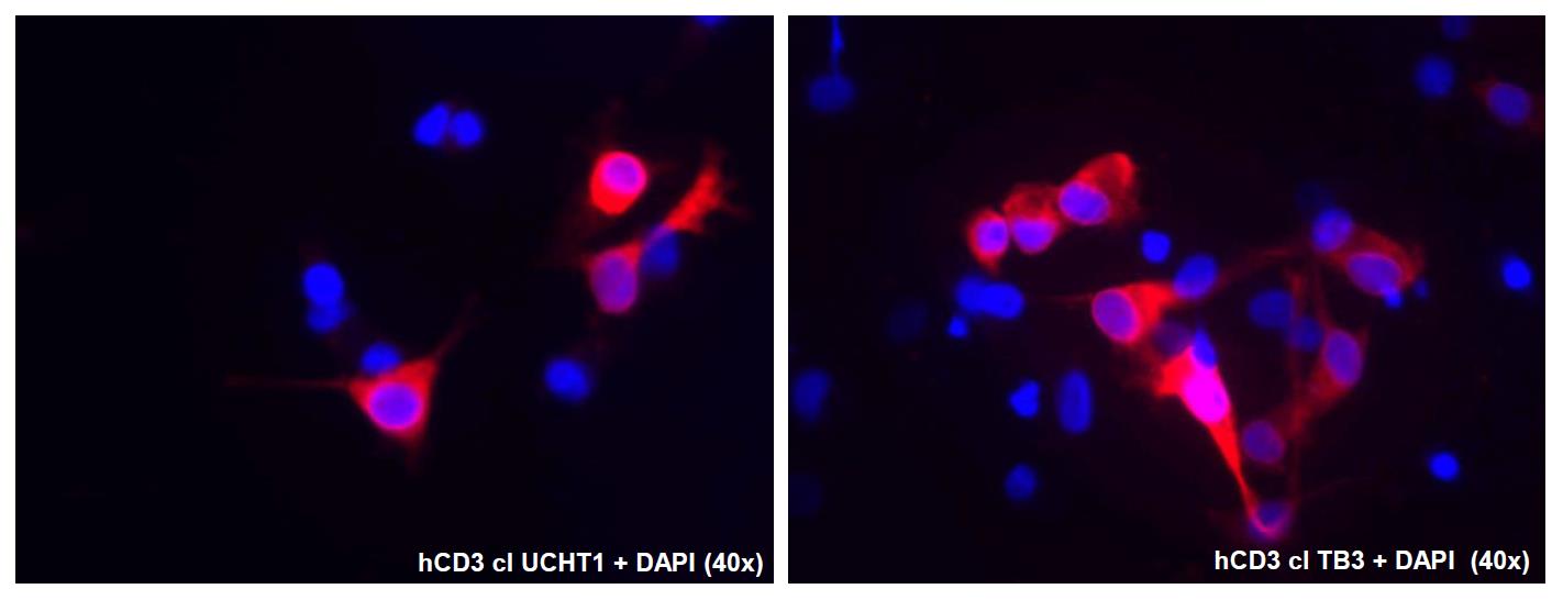 Immunocytochemistry staining of human CD3 epsilon and CD3 gamma transfected COS cells using mouse monoclonal antibodies anti-CD3, clones UCHT1 (left) and TB3 (right) indicated by Alexa Fluor 555 signal (red); DNA stained by DAPI (blue).