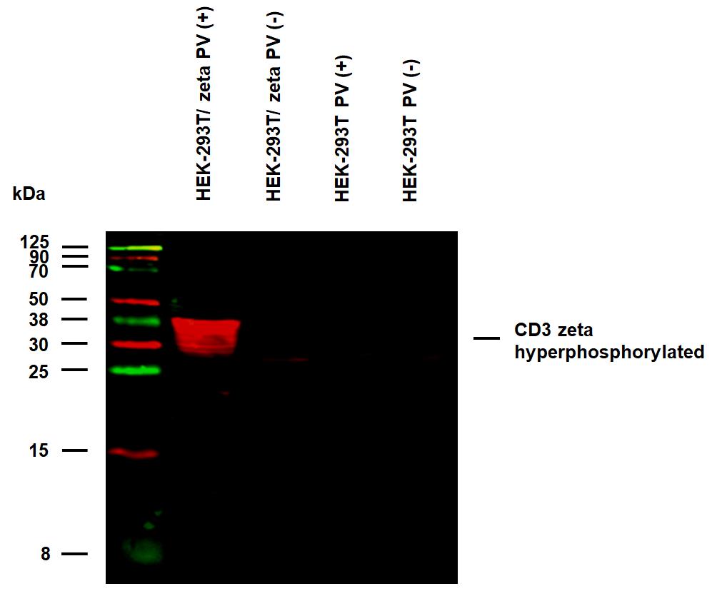 The specificity of EM-55 antibody to phosphorylated Tyr 111 (CD3 zeta chain) was assessed by analysis of binding signals in HEK293T transfected with CD3 zeta/ZAP-70 construct followed by pervanadate (PV) treatment in comparison to the series of control cells – PV untreated transfectants, and both PV treated and untreated mock HEK293T cells.
