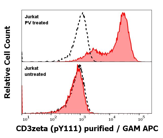 Anti-Hu CD3 zeta (pY111) purified antibody (concentration in sample 1 μg/ml, GAM APC, red-filled histogram) binds specifically to phosphorylated tyrosine 111 (pY111) of CD3 zeta chain in PV treated, methanol permeabilized Jurkat cells (upper panel), but not to untreated methanol permeabilized control cells (lower panel).