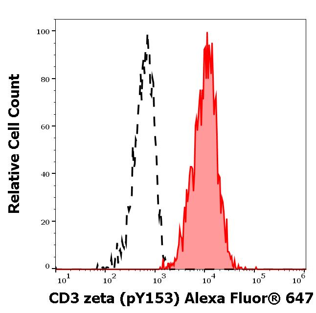Flow cytometry intracellular staining pattern of human PHA activated peripheral blood cells stained using anti-human CD3 zeta (pY153) Alexa Fluor® 647 antibody (concentration in sample 1 μg/ml).