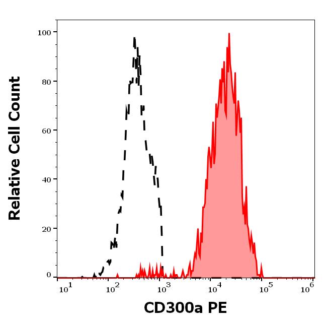 Separation of human monocytes (red-filled) from CD300a negative lymphocytes (black-dashed) in flow cytometry analysis (surface staining) of human peripheral whole blood stained using anti-human CD300a (MEM-260) PE antibody (20 μl reagent / 100 μl of peripheral whole blood).