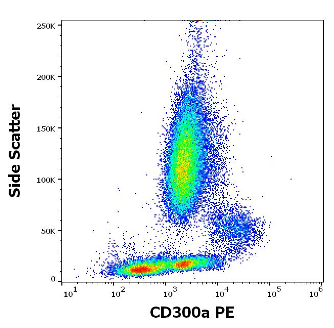 Flow cytometry surface staining pattern of human peripheral whole blood stained using anti-human CD300a (MEM-260) PE antibody (20 μl reagent / 100 μl of peripheral whole blood).
