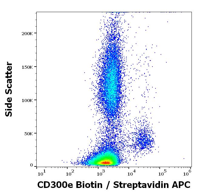 Flow cytometry surface staining pattern of human peripheral whole blood stained using anti-human CD300e (UP-H2) biotin antibody (concentration in sample 0.56 μg/ml, Streptavidin APC).