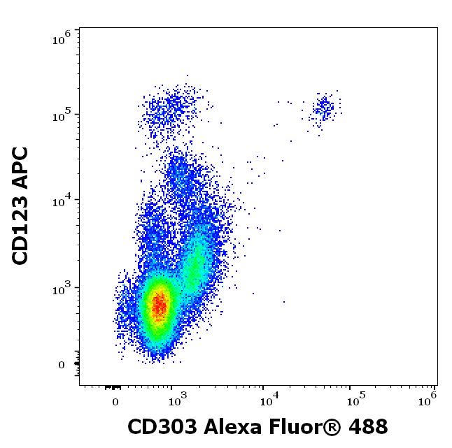 Flow cytometry multicolor surface staining pattern of human mononuclear cells using anti-human CD303 (15E3) Alexa Fluor® 488 antibody (4 μl reagent / 100 μl of peripheral whole blood) and anti-human CD123 (6H6) APC antibody (10 μl reagent / 100 μl of peripheral whole blood).