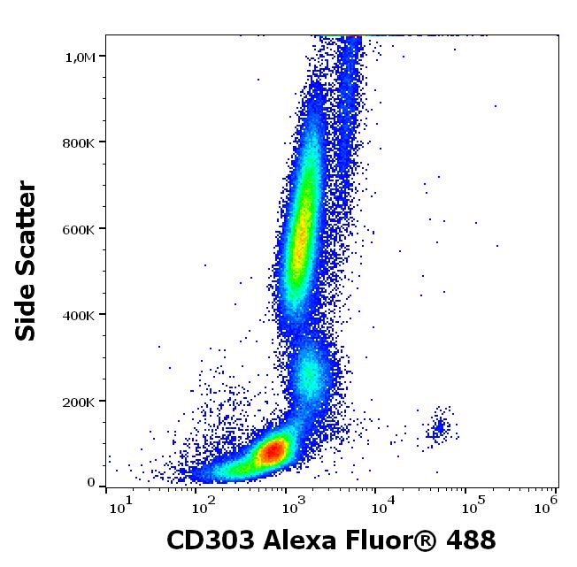 Flow cytometry surface staining pattern of human peripheral whole blood stained using anti-human CD303 (15E3) Alexa Fluor® 488 antibody (4 μl reagent / 100 μl of peripheral whole blood).