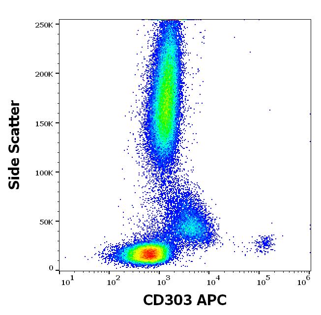 Flow cytometry surface staining pattern of human peripheral whole blood stained using anti-human CD303 (15E3) APC antibody (10 μl reagent / 100 μl of peripheral whole blood).