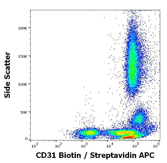 Flow cytometry surface staining pattern of human peripheral whole blood stained using anti-human CD31 (MEM-05) biotin antibody (concentration in sample 4 μg/ml, Streptavidin APC).