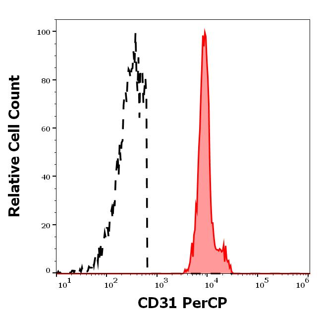 Separation of human monocytes (red-filled) from CD31 negative lymphocytes (black-dashed) in flow cytometry analysis (surface staining) of human peripheral whole blood stained using anti-human CD31 (MEM-05) PerCP antibody (concentration in sample 0.56 μg/ml).
