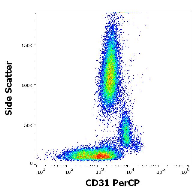 Flow cytometry surface staining pattern of human peripheral whole blood stained using anti-human CD31 (MEM-05) PerCP antibody (concentration in sample 0.56 μg/ml).