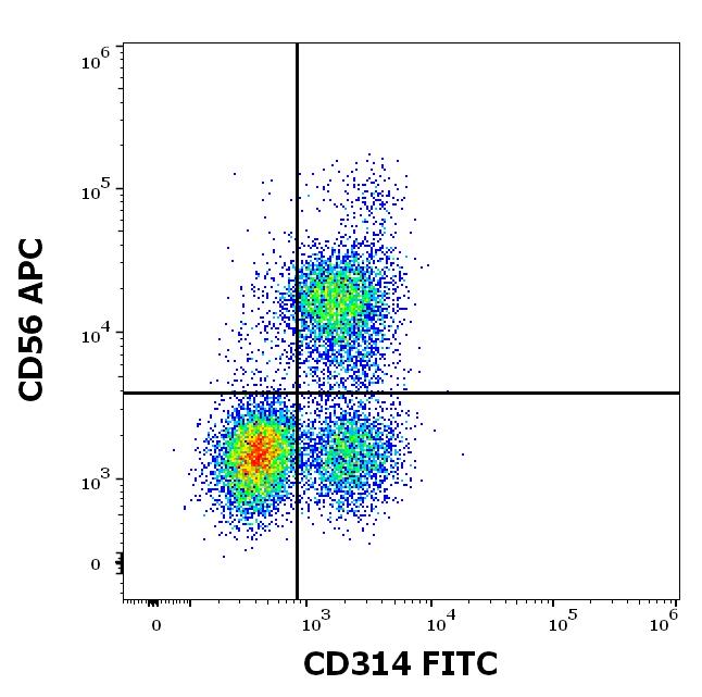Flow cytometry multicolor surface staining of human lymphocytes stained using anti-human CD314 (1D11) FITC antibody (4 μl reagent / 100 μl of peripheral whole blood) and anti-human CD56 (LT56) APC antibody (10 μl reagent / 100 μl of peripheral whole blood).