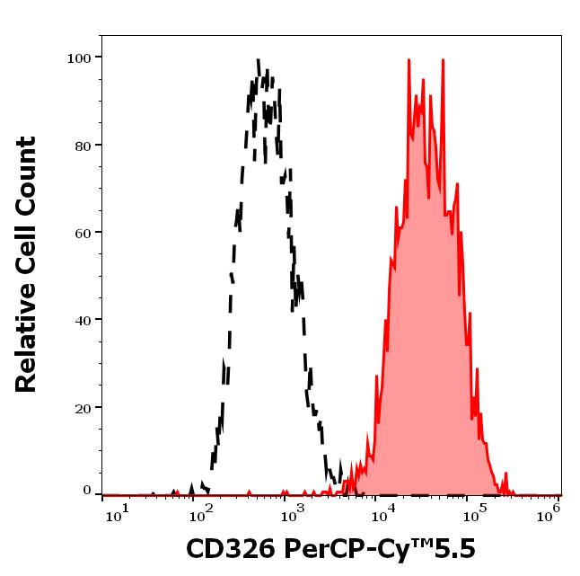 Separation of MCF-7 cells stained using anti-human CD326 (VU-1D9) PerCP-Cy™5.5 antibody (concentration in sample 1.67 μg/ml, red-filled) from MCF-7 cells stained using mouse IgG1 isotype control (MOPC-21) PerCP-Cy™5.5 antibody (concentration in sample 1.67 μg/ml, same as CD326 PerCP-Cy™5.5 concentration, black-dashed) in flow cytometry analysis (surface staining).