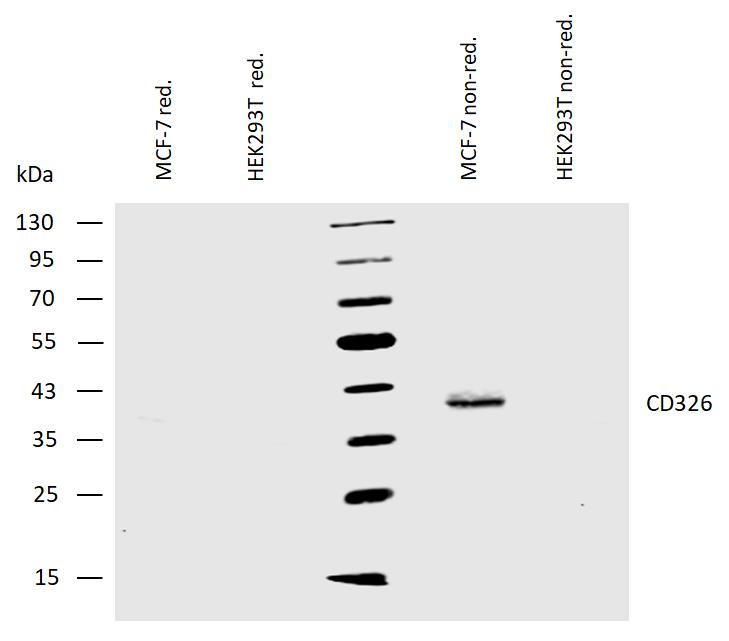 Western blotting analysis of human CD326 using mouse monoclonal antibody VU-1D9 on lysates of MCF-7 cells and HEK293T cells (negative control) under reducing and non-reducing conditions. Nitrocellulose membrane was probed with 2 µg/ml of mouse monoclonal antibody followed by IRDye800-conjugated anti-mouse secondary antibody. CD326 was detected around 40 kDa.