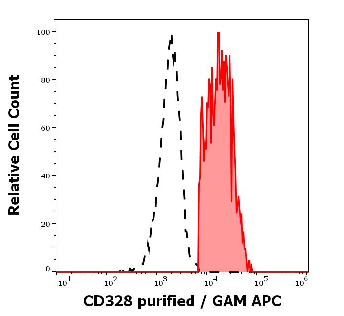 Separation of human CD328 positive lymphocytes (red-filled) from CD328 negative lymphocytes (black-dashed) in flow cytometry analysis (surface staining) of human peripheral whole blood stained using anti-human CD328 (6-434) purified antibody (concentration in sample 3 μg/ml, GAM APC).