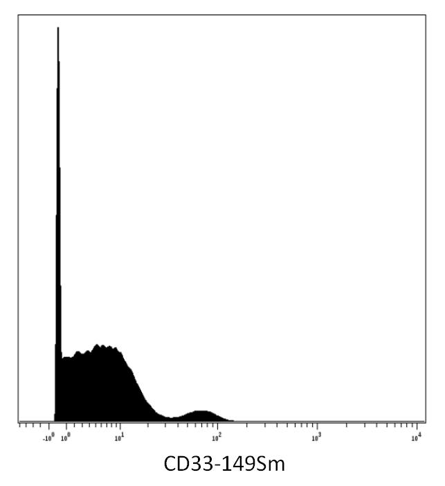 Mass cytometry (surface staining) of human peripheral blood with anti-CD33 (WM53) 149Sm. Gated on singlets.