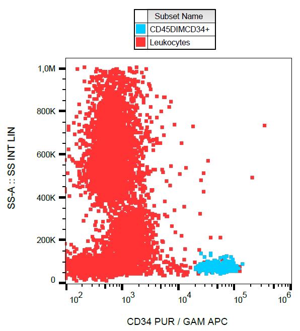 Flow cytometry analysis (surface staining) of CD34+ cells in human peripheral blood with anti-CD34 (581) purified.