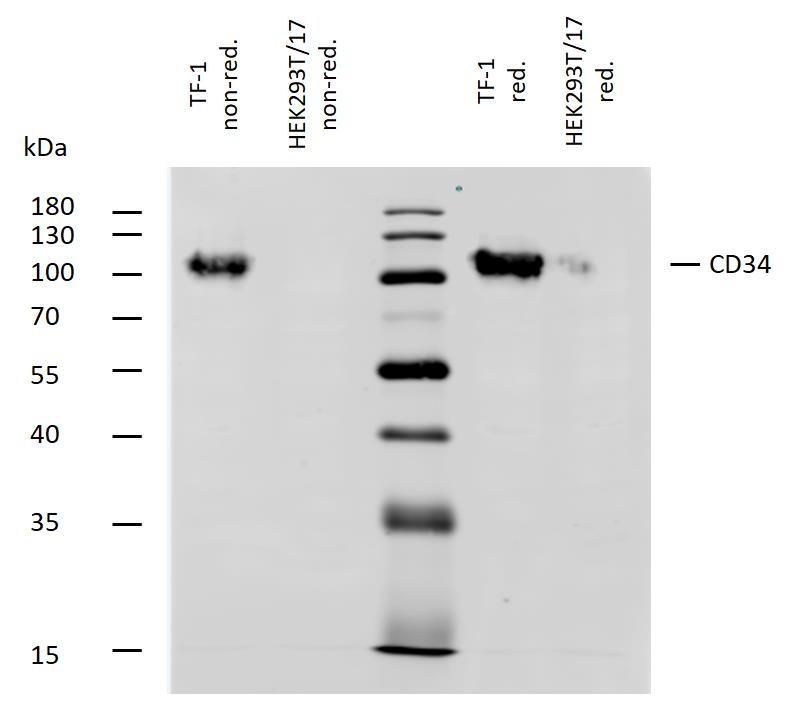 Western blotting analysis of human CD34 using mouse monoclonal antibody QBEnd-10 on lysates of TF-1 cell line and HEK293T/17 cell line (CD34 non-expressing cell line; negative control) under non-reducing and reducing conditions. Nitrocellulose membrane was probed with 2 µg/ml of mouse anti-CD34 monoclonal antibody QBEnd-10 followed by IRDye800-conjugated anti-mouse IgG1 secondary antibody. A specific band was detected for CD34 protein at approximately 110 kDa.