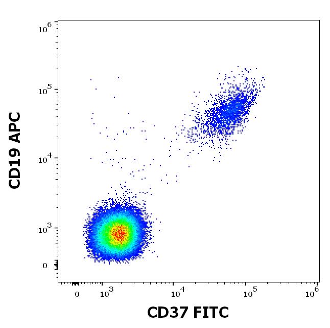 Flow cytometry multicolor surface staining pattern of human lymphocytes stained using anti-human CD19 (LT19) APC antibody (10 μl reagent / 100 μl of peripheral whole blood) and anti-human CD37 (MB-1) FITC antibody (4 μl reagent / 100 μl of peripheral whole blood).