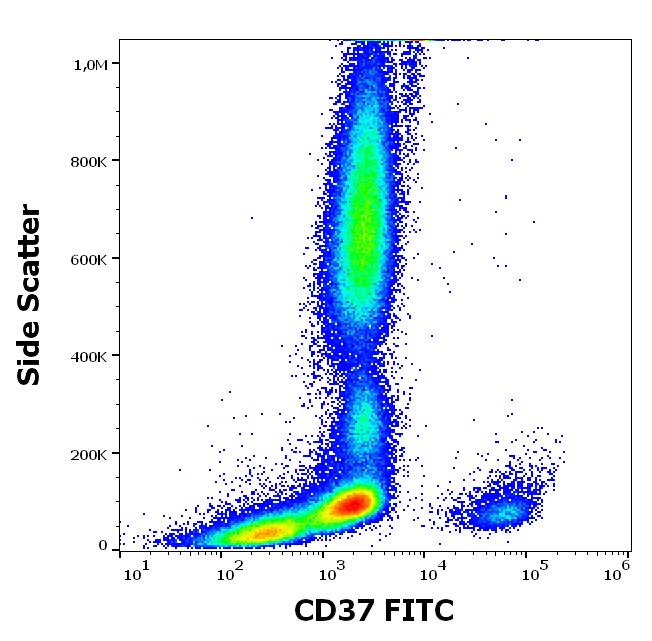 Flow cytometry surface staining pattern of human peripheral whole blood stained using anti-human CD37 (MB-1) FITC antibody (4 μl reagent / 100 μl of peripheral whole blood).