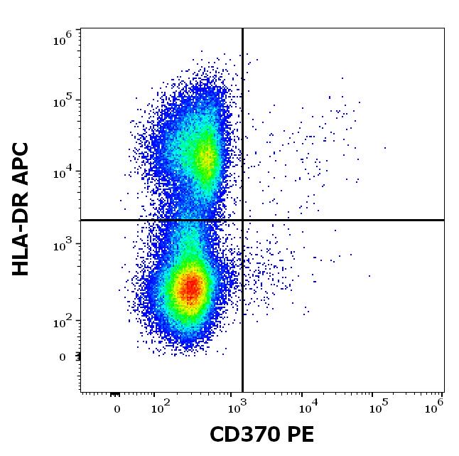 Flow cytometry multicolor surface staining of human peripheral blood mononuclear cells stained using anti-human CD370 (8F9) PE antibody (10 μl reagent / 100 μl of peripheral whole blood) and anti-human HLA-DR (MEM-12) APC antibody (10 μl reagent / 100 μl of peripheral whole blood).