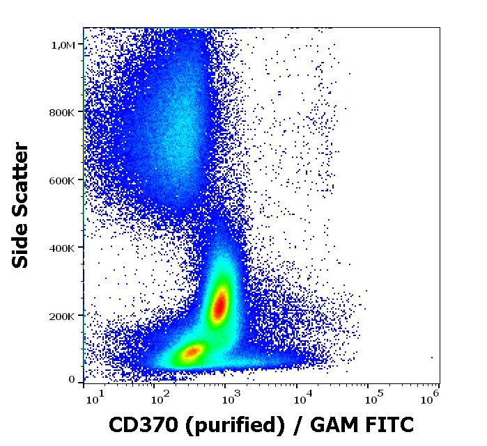 Flow cytometry surface staining pattern of human peripheral whole blood stained using anti-human CD370 (8F9) purified antibody (concentration in sample 1,67 µg/ml) GAM FITC.
