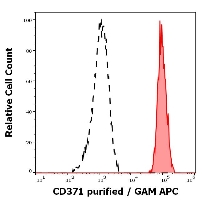 Separation of human monocytes (red-filled) from lymphocytes (black-dashed) in flow cytometry analysis (surface staining) of human peripheral whole blood stained using anti-human CD371 (50C1) purified antibody (concentration in sample 1.67 μg/ml, GAM APC).