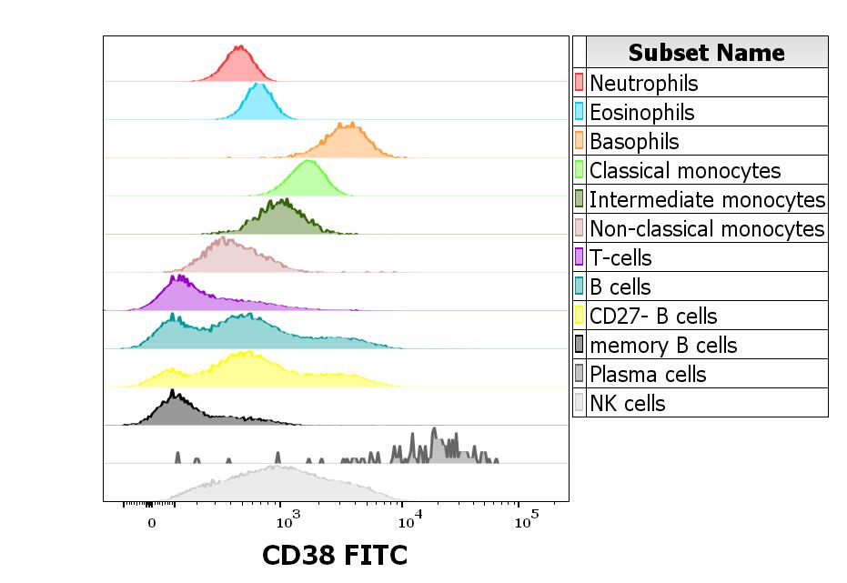 Reactivity of Anti-human CD38 FITC antibody (clone HIT2) on human peripheral leukocytes