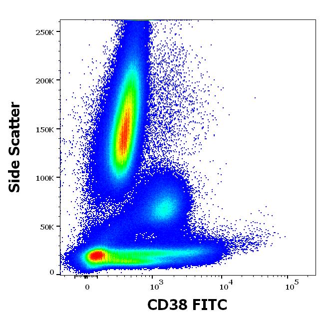Mouse monoclonal anti-human CD38 FITC antibody (clone HIT2) in concentration 0.5 µg/ml in stained stained blood sample (2 x 10