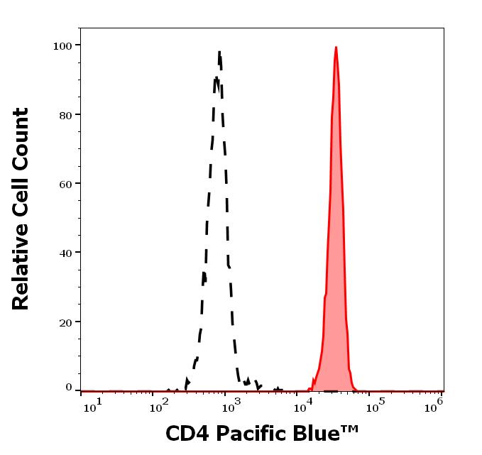 Separation of human CD4 positive lymphocytes (red-filled) from neutrophil granulocytes (black-dashed) in flow cytometry analysis (surface staining) of human peripheral whole blood stained using anti-human CD4 (MEM-241) Pacific Blue™ antibody (4 μl reagent / 100 μl of peripheral whole blood).