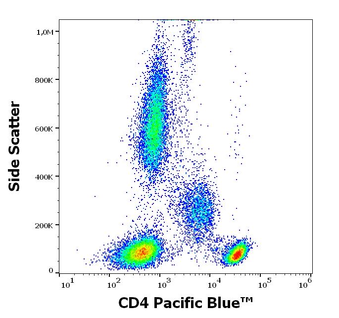 Flow cytometry surface staining pattern of human peripheral whole blood stained using anti-human CD4 (MEM-241) Pacific Blue™ antibody (4 μl reagent / 100 μl of peripheral whole blood).