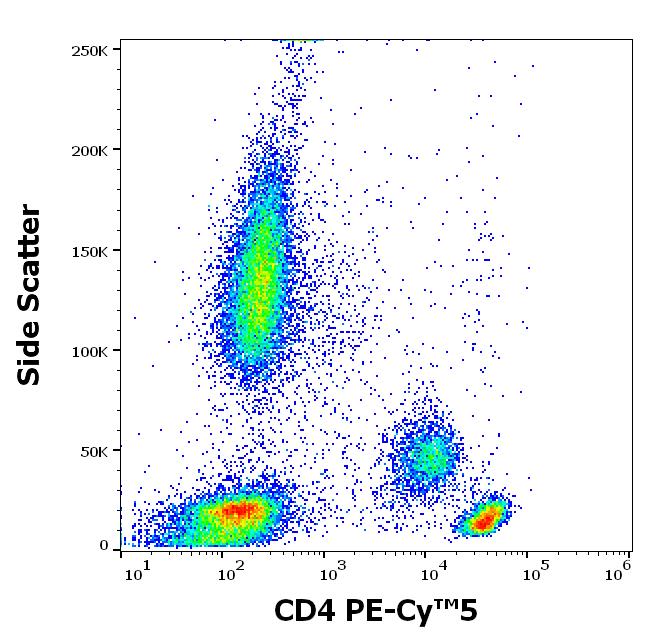 Flow cytometry surface staining pattern of human peripheral whole blood stained using anti-human CD4 (MEM-241) PE-Cy™5 antibody (4 μl reagent / 100 μl of peripheral whole blood).