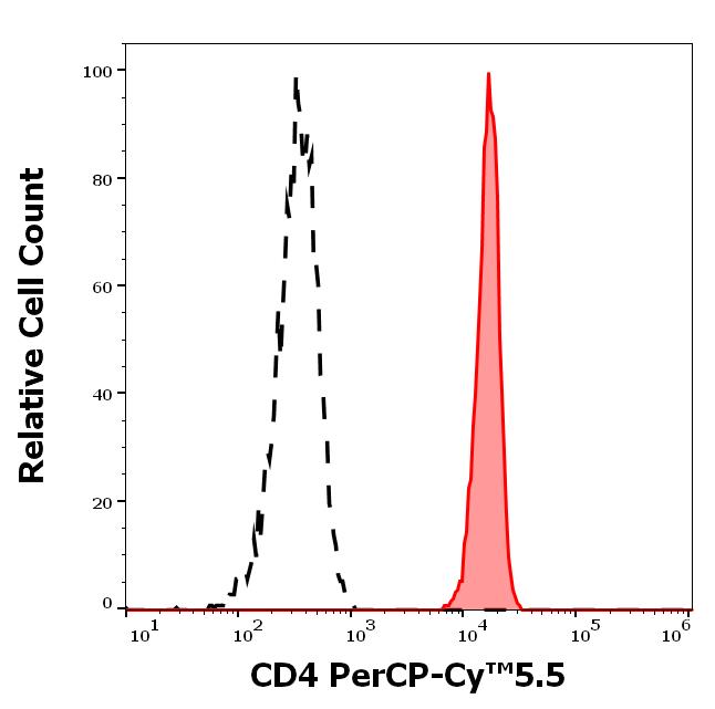 Separation of human CD4 positive lymphocytes (red-filled) from CD4 negative lymphocytes (black-dashed) in flow cytometry analysis (surface staining) of human peripheral whole blood stained using anti-human CD4 (MEM-241) PerCP-Cy™5.5 antibody (concentration in sample 0.33 μg/ml).