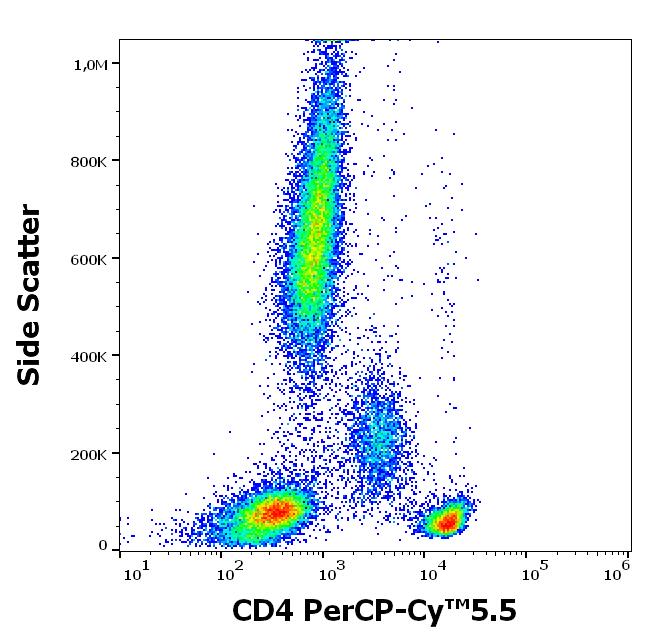 Flow cytometry surface staining pattern of human peripheral whole blood stained using anti-human CD4 (MEM-241) PerCP-Cy™5.5 antibody (concentration in sample 0.33 μg/ml).