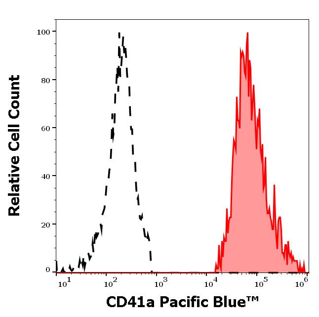 Separation of human CD41a positive thrombocytes (red-filled) from CD41a negative lymphocytes (black-dashed) in flow cytometry analysis (surface staining) of human peripheral whole blood stained using anti-human CD41a (HIP8) Pacific Blue™ antibody (4 μl reagent / 100 μl of peripheral whole blood).