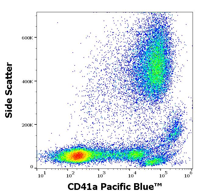 Flow cytometry surface staining pattern of human peripheral whole blood stained using anti-human CD41a (HIP8) Pacific Blue™ antibody (4 μl reagent / 100 μl of peripheral whole blood).