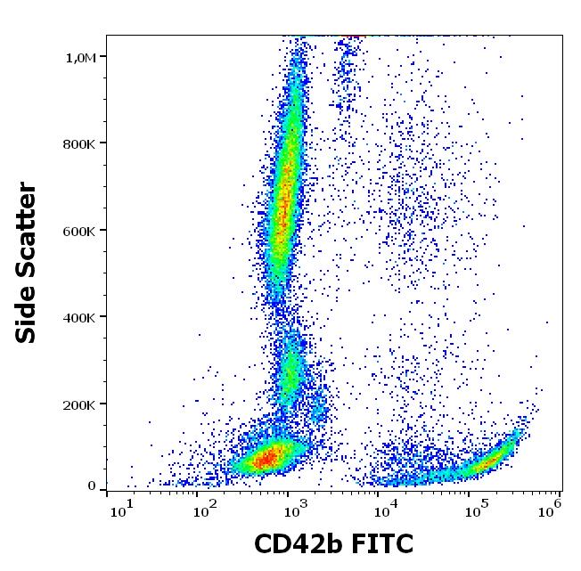 Flow cytometry surface staining pattern of human peripheral whole blood stained using anti-human CD42b (AK2) FITC antibody (4 μl reagent / 100 μl of peripheral whole blood).