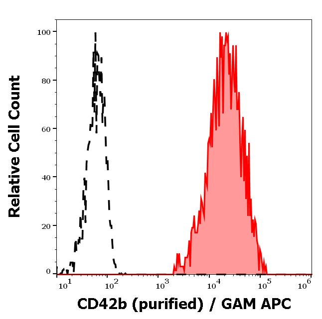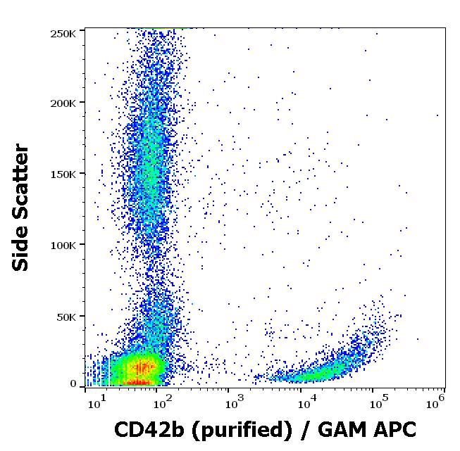 Flow cytometry surface staining pattern of human peripheral blood cells stained using anti-human CD42b (HIP1) purified antibody (concentration in sample 4 μg/ml) GAM APC.